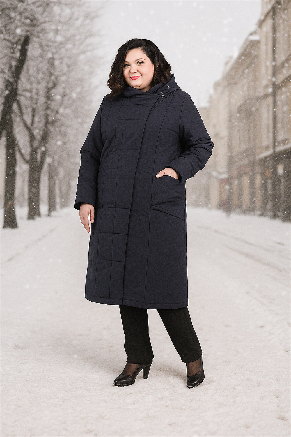 УП 613 Д ДЛИННОЕ ДЕМИСЕЗОННОЕ ПАЛЬТО Ткань: 97% ПЭ, 3% лайкра Утеплитель : Альполюкс 150 гр/м2 Длина 120 см Длинное демисезонное пальто в темно-синем цвете будет прекрасным выбором на холодную погоду. Благодаря нетканому утеплителю из микроволокна с плотностью 150 г/м2 изделие подойдет на позднюю осень и раннюю зиму. Наполнитель хорошо сохраняет тепло и не деформируется. Плащевая ткань пропитана составом, защищающим от промокания и продувания ветром. Также пропитка не дает ткани выгорать на солнце. Пальто представлено в больших размерах до 64 включительно. Оно застегивается на молнию, закрытую широкой планкой. Несъемный капюшон можно отрегулировать. По бокам расположены два больших накладных кармана.